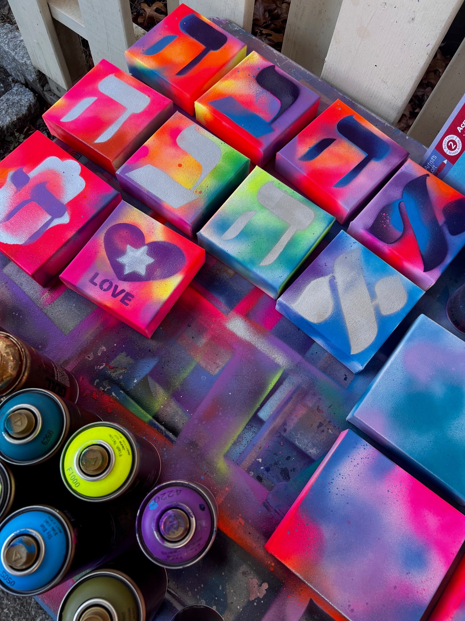 This set of 4 mini canvases put together spells AHAVA, Hebrew for LOVE. The perfect pop of color for a bookshelf or built in, for a bedroom or in the most popular room of your house. These Simcha Minis are made to order, please allow 2-3 weeks. I will update you with a processing and delivery time as soon as I can. If you have particular colors you would like, please add that into the order notes.